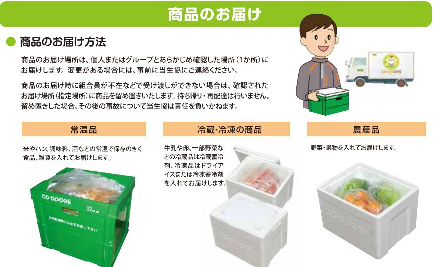 利用者は、次回の配達日までに、空になった保冷箱や記入済みの注文用紙を事前に指定された場所に置いておくだけで、配達員が回収してくれます。