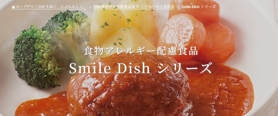 食物アレルギーを持つ方向けに「Smile Dishシリーズ」というアレルギー配慮食品も用意されており、主要な8大アレルゲン(卵・乳・小麦・そば・落花生・えび・かに・くるみ)の表示も徹底されています。